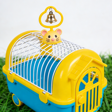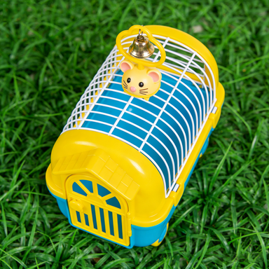 Som visas i den blå-gula djurburen, speciellt designad för små husdjur, med söt mushuvuddekoration och guldklocka. Grossistpris $12-15/enhet (baserat på MOQ), minsta beställning 100 enheter, stödjande funktionsanpassning och privat märkning.